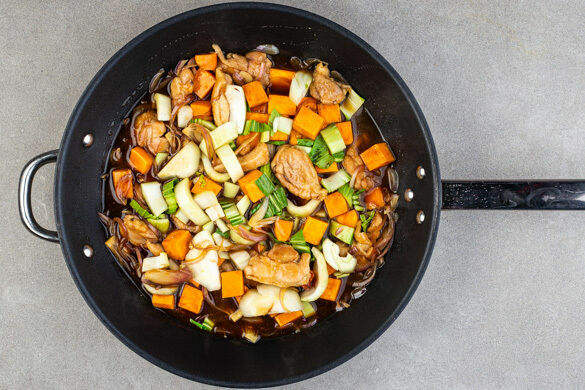 Die Süßkartoffeln und den Knoblauch dazugeben und bei mittlerer Hitze ca. 3Min. mitbraten. Dann mit der Sojasauce, der Fischsauce und 80ml Wasser ablöschen. ½TL (braunen) Zucker einrühren, die Flüssigkeit aufkochen lassen und weitere ca. 6Min. köcheln. Den Pak Choi für die letzten 3Min. dazugeben und mitgaren.