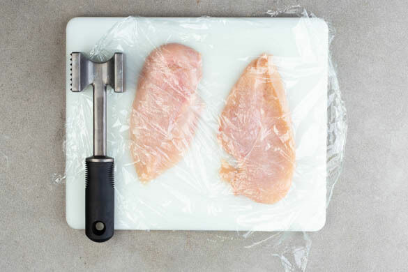 Das Fleisch trocken tupfen, jeweils horizontal halbieren und zwischen zwei Lagen Frischhaltefolie mit einem Fleischklopfer, dem Boden einer schweren Pfanne oder dem Boden eines schweren Topfes flach klopfen. Das Fleisch mit 2EL Olivenöl sowie je 1 kräftigen Prise Salz und Pfeffer einreiben.