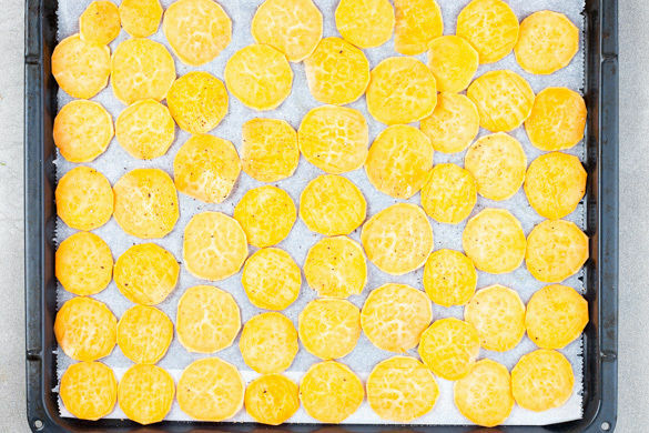 Den Backofen auf 220°C (200°C Umluft) vorheizen. Die Süßkartoffel schälen und in ca. 2mm dünne Scheiben schneiden. Tipp: Das geht am besten mit einem Gemüsehobel. Die Süßkartoffelscheiben auf einem mit Backpapier ausgelegten Backblech mit je 1 kräftigen Prise Salz und Pfeffer sowie 2TL Olivenöl vermengen und ca. 20Min. im Ofen knusprig backen. Nach der Hälfte der Zeit wenden.
