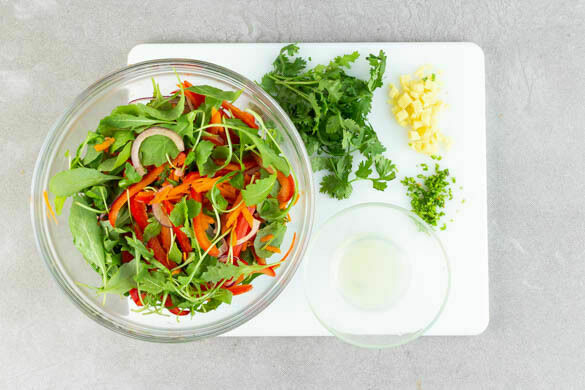 Die Paprika halbieren, entkernen und in kleine Würfel schneiden. Mit den Karottenraspeln, den Zwiebeln und dem Salat vorsichtig vermengen. Die Korianderblätter von den Stängeln zupfen, fein schneiden und ebenfalls untermischen, die Korianderstiele aufbewahren. Die Limetten halbieren und auspressen. Den Ingwer schälen und fein reiben.