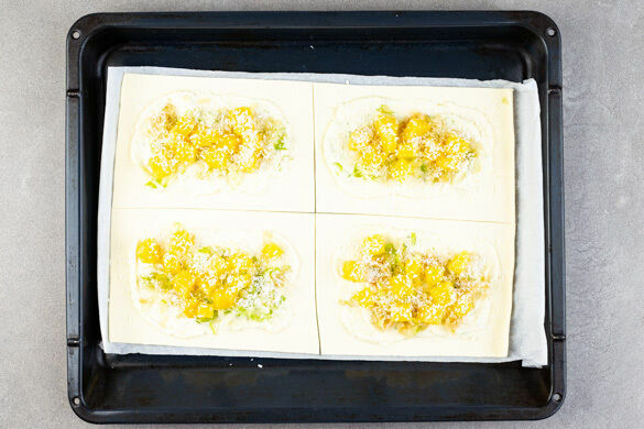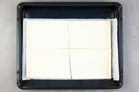 Den Teig mit dem Papier nach unten auf einem Backblech ausrollen und in 4 Rechtecke schneiden.