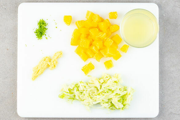 Den Backofen auf 200°C (180°C Umluft) vorheizen. Die ½ der Ananas in ein Sieb abgießen, den Saft auffangen. Die Ananas in ca. 1cm große Würfel schneiden. Den Ingwer schälen und fein reiben. Die Limettenschale abreiben, dann die Limette halbieren und auspressen. Den Apfel vierteln, entkernen und mit einer Küchenreibe grob raspeln.