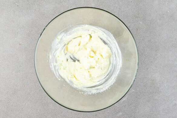 Die Crème fraîche mit dem Ingwer, 1TL Limettenschale, 1EL Limettensaft und 2EL Zucker verrühren.