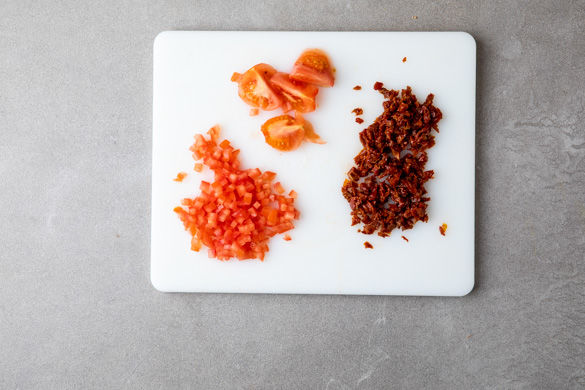 Inzwischen die getrockneten Tomaten in kleine Würfel schneiden. Die frische Tomate vierteln, die Kerne und das Fruchtfleisch entfernen und die Tomate ebenfalls in kleine Würfel schneiden. Die getrockneten Tomaten getrennt von den frischen Tomaten aufbewahren.