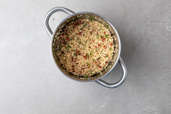 Die getrockneten Tomatenwürfel und die gehackte Petersilie unter den Couscous mischen und den Couscous mit einer Gabel auflockern. Nach Wunsch mit etwas Salz abschmecken.