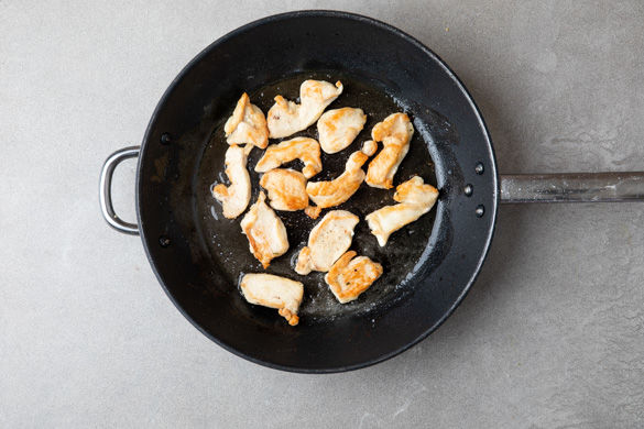 Das Hähnchen trocken tupfen, in schräge, ca. 1-2cm dicke Scheiben schneiden, mit Salz und Pfeffer würzen und von beiden Seiten in 1-2EL Mehl wenden. In einer mittelgroßen Pfanne mit 1-2EL Olivenöl ca. 2-3Min. von jeder Seite goldbraun braten, dann mit dem Couscous und der Salsa servieren.