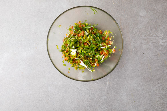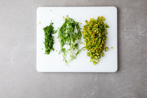 Die Paprika vierteln, entkernen und in möglichst kleine Würfel schneiden. Die Lauchzwiebeln schräg in hauchdünne Ringe schneiden. Die Petersilie samt Stängeln fein hacken.