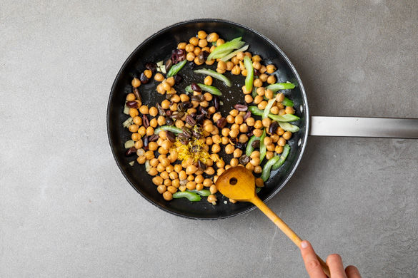 In einer mittelgroßen Pfanne den Knoblauch mit dem Sellerie mit ca. 1-2EL Olivenöl ca. 1-2Min. auf mittlerer Hitze anbraten. Die Kichererbsen und die Oliven zugeben und die Pfanne vom Herd nehmen. Mit 1-2TL Zitronenabrieb und 1-2TL Zitronensaft ablöschen.