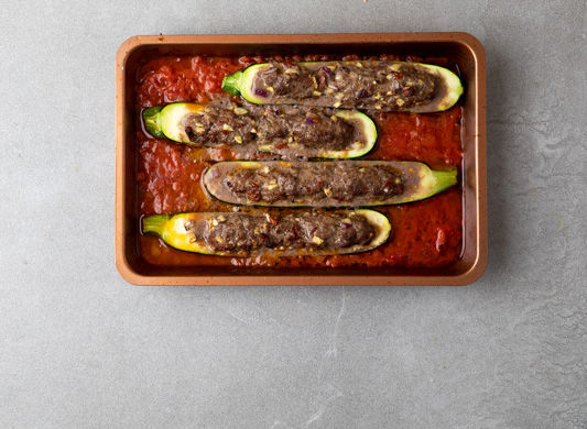 Da weiß die Zucchini gar nicht, wie ihr geschieht: Sie wird gefüllt mit einer Mischung aus saftigem Rinderhackfleisch, getrockneten Tomaten, würzigem Rosmarin, Zwiebeln und Knobi und auf einer fruchtigen Tomatensauce im Ofen geschmort. Dazu gibt es knuspriges Käsebaguette - mehr Aroma geht nimmer!