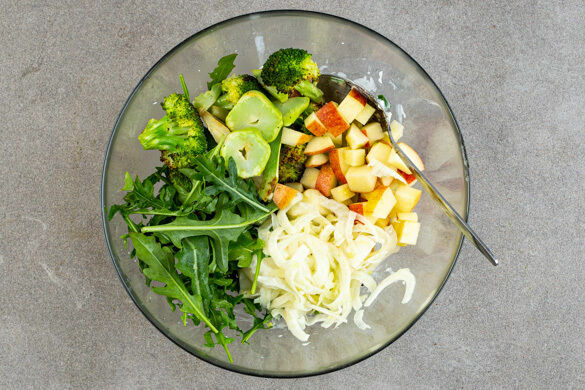 In diesem Salat ist fast alles zu finden, was das Obst- und Gemüseregal so hergibt. Na ja, okay, zumindest einiges: Brokkoli, Fenchel und Rucola sind dabei, und auch ein paar Apfelstückchen und knackige Walnusskerne haben sich auf die Salatparty geschlichen. Mit unserem Schnittlauchdressing sind die essbaren Partygäste bestens gekleidet, aber der Star des Abends ist der süß-salzig marinierte Tofu aus dem Ofen. Guten Appetit!