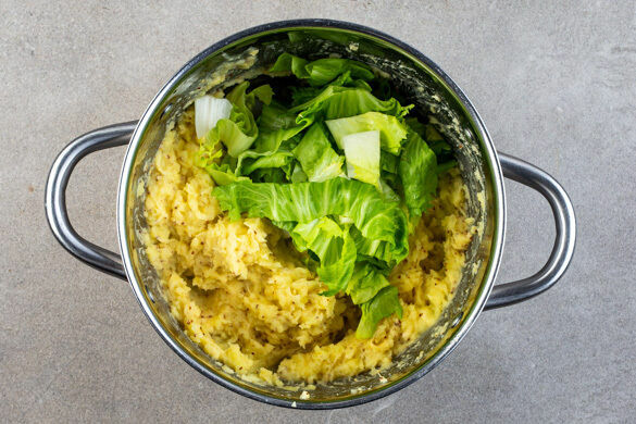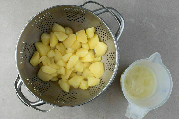 Die Kartoffeln in das kochende Wasser geben und in 12–15Min. bissfest kochen. Mit einem Messbecher ca. 200ml Kochwasser abschöpfen, dann die Kartoffeln in einem Sieb abtropfen lassen und zurück in den Topf geben.