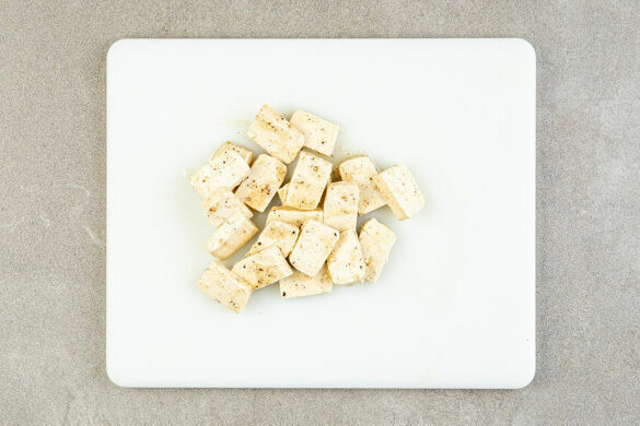 Den Tofu auf ein oder ggf. zwei mit Backpapier ausgelegte(s) Backblech(e) geben und gleichmäßig verteilen, sodass sich die Tofuscheiben nicht berühren. Im Ofen 20–24Min. goldbraun und knusprig backen.