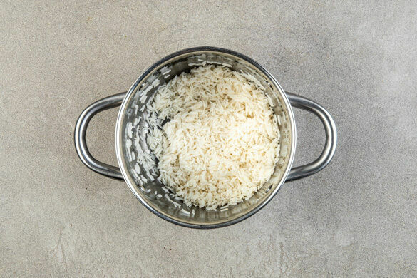 Den Reis in einem Sieb kalt abspülen, bis das Wasser klar bleibt. Sobald das Wasser kocht, den Reis hineingeben und abgedeckt bei niedrigster Hitze 10–12Min. kochen, bis das Wasser aufgesogen und der Reis gar ist. Noch ca. 5Min. ohne Hitzezufuhr ziehen lassen.