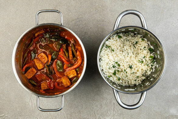 Na, mal wieder Lust auf leckeres Curry? So ein Zufall – wir haben gerade eins im Angebot! Das heutige Exemplar kommt mit knackiger Paprika, zarten grünen Bohnen und goldbraun gebackenen Tofuscheiben daher. Sie alle baden in einer köstlichen Sauce, die dank Ingwer, Knoblauch und einer leckeren Gewürzmischung richtig viel Aroma auf den Tisch bringt. Dazu gibt es natürlich flockigen Reis, garniert wird mit feinem Koriander. Mmmh!