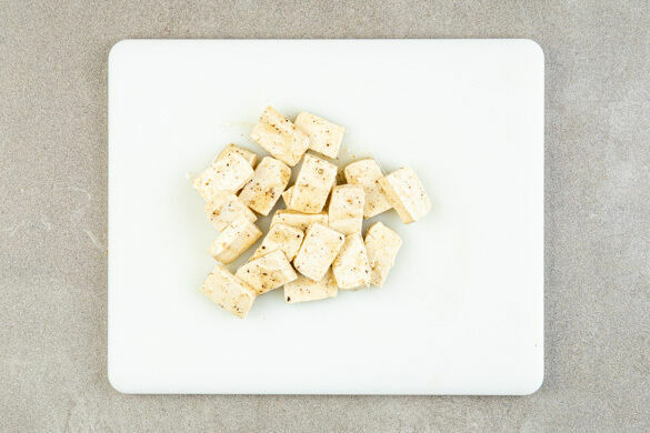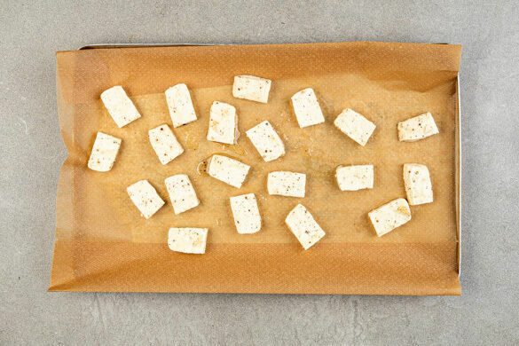 Den Tofu auf ein mit Backpapier ausgelegtes Backblech geben und gleichmäßig verteilen, sodass sich die Tofuscheiben nicht berühren. Im Ofen 20–24Min. goldbraun und knusprig backen.