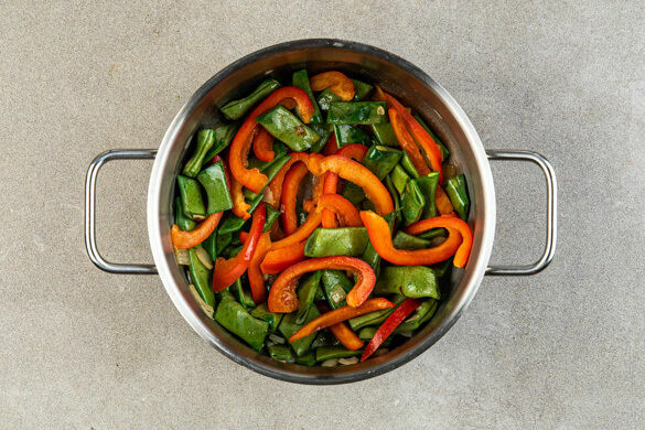 Die Zwiebel schälen, halbieren und grob würfeln. Die Zwiebeln in einem mittelgroßen Topf mit 2EL Margarine bei mittlerer Hitze 5–7Min. anschwitzen. Die Paprika vierteln, entkernen und in dünne Streifen schneiden. Die Bohnen in ca. 4cm große Stücke schneiden, dabei die Enden entfernen. Die Paprika und die Bohnen zu den Zwiebeln geben und ca. 5Min. mitbraten.