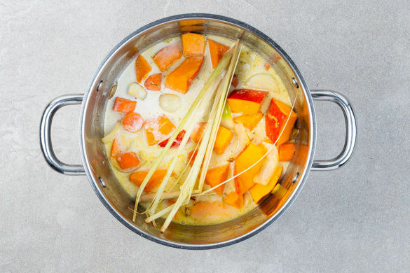 Die Zwiebeln und die Karotten in einem großen Topf mit 1EL Öl bei mittlerer Hitze ca. 2Min. anbraten. Den gewürfelten Ingwer und den zerdrückten Knoblauch dazugeben und 1Min. mitbraten, dann den Kürbis und das Zitronengras ebenfalls 2–3Min. mitbraten. Mit der Kokosmilch und 250–350ml Wasser ablöschen, das Brühgewürz zugeben und alles ca. 15Min. abgedeckt köcheln.