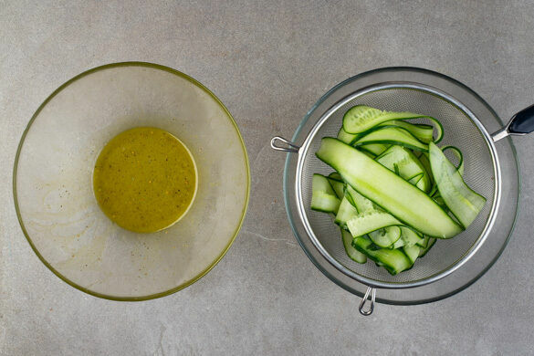Die Gurke mit einem Sparschäler in breite Streifen schneiden. In einem Sieb mit 1TL Salz vermischen und ziehen lassen. In einer großen Schüssel 1EL hellen Essig und 1EL Zucker verrühren, bis sich der Zucker aufgelöst hat.