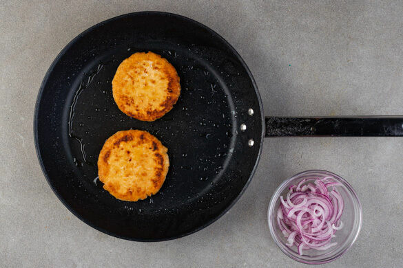 Die Pattys in einer mittelgroßen Pfanne mit 1EL Pflanzenöl bei mittlerer Hitze auf jeder Seite ca. 3Min. goldbraun anbraten. Währenddessen die Zwiebel halbieren. Eine Hälfte schälen und in feine Streifen schneiden, die übrige Zwiebel für ein anderes Rezept aufbewahren.
