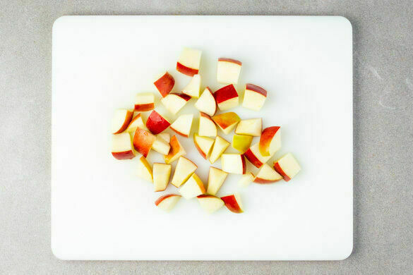 Den Backofen auf 240°C (220°C Umluft) vorheizen. Die Süßkartoffeln schälen, längs halbieren und in 1–2cm dicke Scheiben schneiden. Die Tomaten in kleine Würfel schneiden.