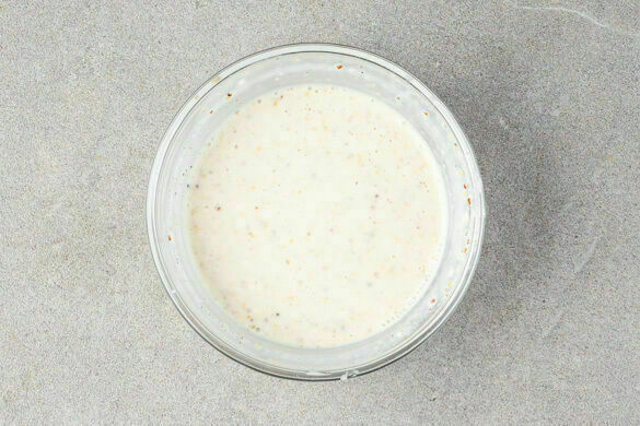 Die Mayonnaise mit dem Senf, 3–4EL Essig, 100ml Wasser, 1TL Zucker und 2 Prisen Salz zu einem Dressing verrühren.