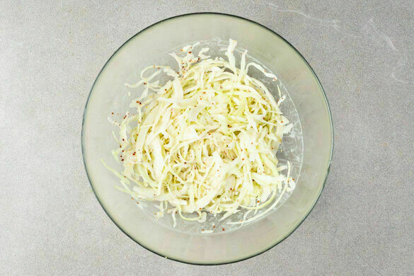 Den Kohl mit 2 Prisen Salz vermengen und mit den Händen ca. 1Min. kräftig durchkneten, bis der Kohl weich ist. Die 1/2 des Dressings unterrühren.