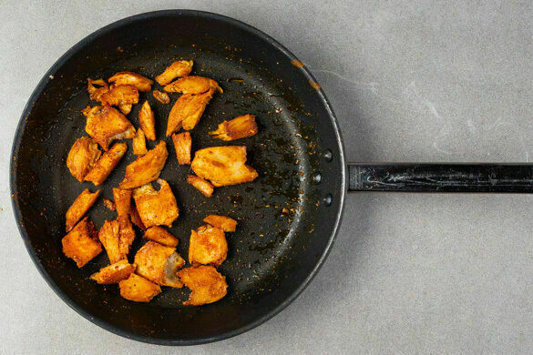 Die veganen Hähnchenschnetzel in einer großen Pfanne mit 2EL Olivenöl, der Gewürzmischung und 1 kräftigen Prise Salz bei starker Hitze 4–6Min. goldbraun anbraten.