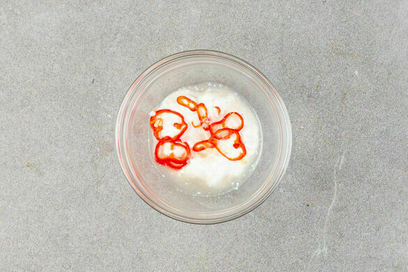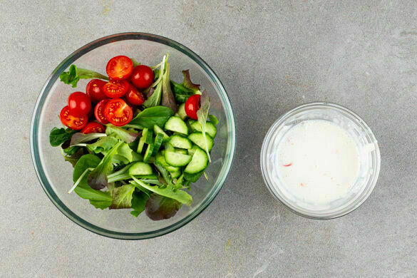 Die vegane Mayonnaise mit den Peperoniringen, 3–4EL Essig und 3–4EL Wasser zu einem cremigen Dressing verrühren. Mit Salz abschmecken.