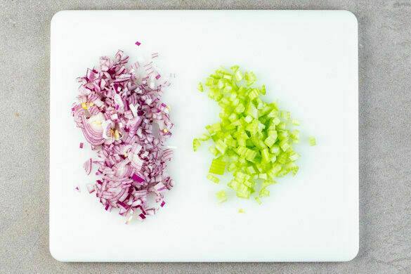 Den Backofen auf 180°C (160°C Umluft) vorheizen. Die Zwiebeln schälen, halbieren und fein würfeln. Den Sellerie in ca. 1cm kleine Würfel schneiden. Die Bohnen in einem Sieb mit kaltem Wasser abspülen und abtropfen lassen.