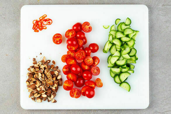 Inzwischen die Gurke längs halbieren und in dünne Scheiben schneiden. Die Kirschtomaten halbieren. Die Mandeln grob hacken. Die 1/2 der Peperoni oder mehr nach Geschmack in feine Ringe schneiden. Tipp: Für weniger Schärfe die Kerne entfernen.