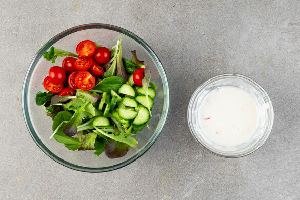 Die vegane Mayonnaise mit den Peperoniringen, 1–2EL Essig und 3EL Wasser zu einem cremigen Dressing verrühren. Mit Salz abschmecken.