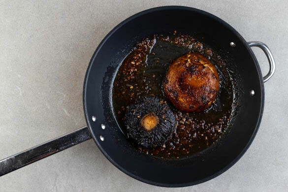 Ggf. vorhandene Pilzstiele abtrennen. Die Pilze mit den Lamellen nach unten in der ersten Pfanne mit ½EL Margarine bei mittlerer bis starker Hitze 4–6Min. braten, dabei mit einem Pfannenwender flach drücken, damit sie gleichmäßig garen. Die Pilze wenden und weitere 2–4Min. braten, bis sie appetitlich gebräunt und weich sind.