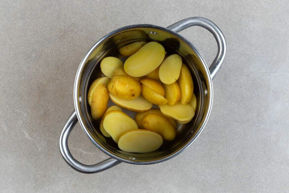 Die Kartoffeln samt Schale je nach Größe halbieren oder vierteln und in einen großen Topf mit ausreichend gesalzenem Wasser geben, das Wasser aufkochen. Die Kartoffeln bei mittlerer bis niedriger Hitze 15–18Min. kochen, bis sie gar sind, anschließend in ein Sieb abgießen.