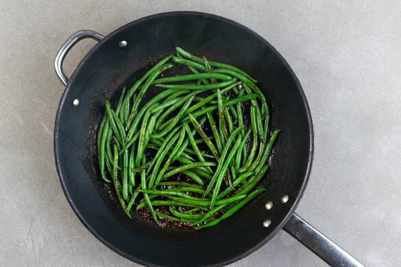 Die Bohnen in einer zweiten großen Pfanne mit 1EL Margarine bei mittlerer bis starker Hitze ca. 6Min. anbraten, bis sie appetitlich gebräunt sind, dabei gelegentlich umrühren. Die Bohnen aus der Pfanne nehmen und mit der Sojasauce sowie 1TL Ahornsirup oder mehr nach Geschmack vermengen.