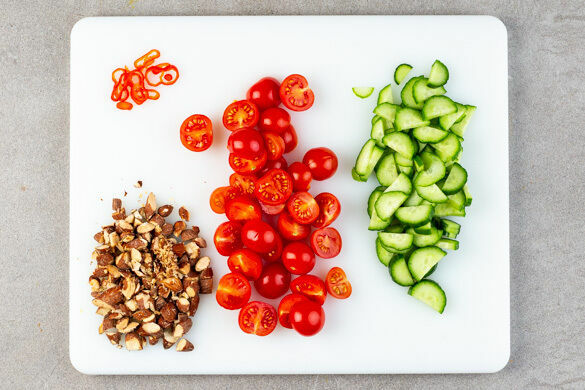 Inzwischen die Gurke längs halbieren und in dünne Scheiben schneiden. Die Kirschtomaten halbieren. Die Mandeln grob hacken. 1/4 der Peperoni oder mehr nach Geschmack in feine Ringe schneiden. Tipp: Für weniger Schärfe die Kerne entfernen.