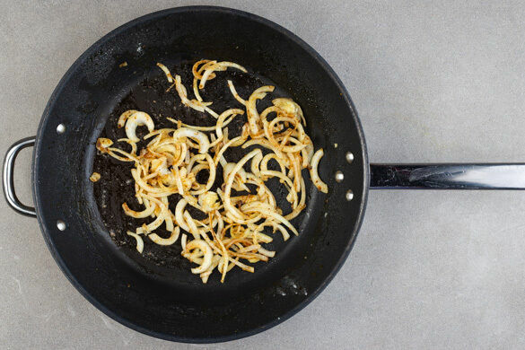 Die Zwiebeln mit 1EL Mehl bestäuben und erneut ca. 1Min. braten, dann unter ständigem Rühren 400ml Brühe angießen. Die Brühe zum Kochen bringen, anschließend bei mittlerer bis niedriger Hitze 2–3Min. köcheln lassen, bis die Sauce eingedickt ist.