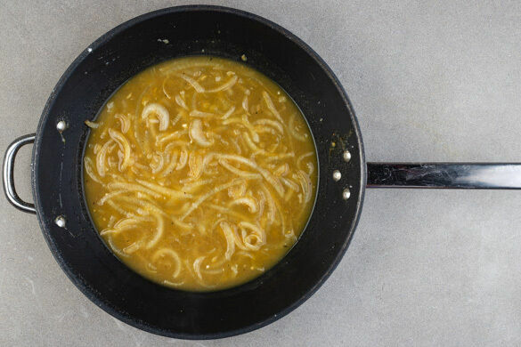 Die Zwiebeln mit 1TL Mehl bestäuben und erneut ca. 1Min. braten, dann unter ständigem Rühren 200ml Brühe angießen. Die Brühe zum Kochen bringen, anschließend bei mittlerer bis niedriger Hitze 2–3Min. köcheln lassen, bis die Sauce eingedickt ist.