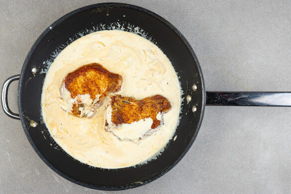 Die Hitze reduzieren, 1EL Zitronensaft sowie die ½ der Crème fraîche einrühren, dann mit Salz und Pfeffer abschmecken und die Sauce noch 1–2Min. köcheln lassen, bis sie die gewünschte Konsistenz erreicht hat. Das Fleisch in die Sauce legen und bei niedriger Hitze 4–6Min. köcheln, bis das Fleisch gar ist. Ggf. mehr Brühe angießen.