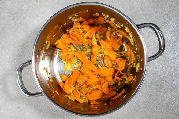Die Zwiebeln schälen, halbieren und in dünne Streifen schneiden. Den Knoblauch und den Ingwer schälen und grob würfeln. Die Karotten ggf. schälen, längs halbieren und in dünne Scheiben schneiden. Alles in einem großen Topf mit 2EL Pflanzenöl bei mittlerer Hitze unter gelegentlichem Rühren 6–8Min. braten. Die Kokosmilch und die Mandeln in ein hohes Püriergefäß geben.