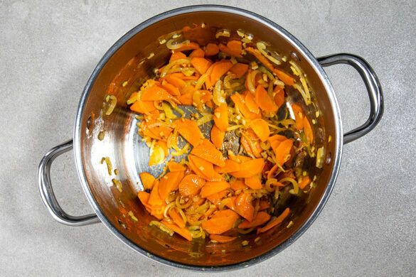 Die Zwiebel schälen, halbieren und in dünne Streifen schneiden. Den Knoblauch und den Ingwer schälen und grob würfeln. Die Karotte ggf. schälen, längs halbieren und in dünne Scheiben schneiden. Alles in einem mittelgroßen Topf mit 1EL Pflanzenöl bei mittlerer Hitze unter gelegentlichem Rühren 6–8Min. braten. Die Kokosmilch und die Mandeln in ein hohes Püriergefäß geben.