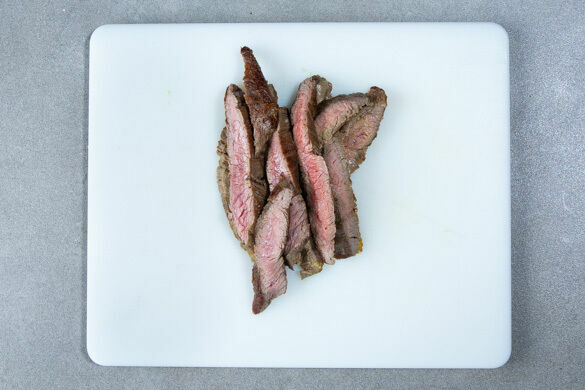 Das Fleisch trocken tupfen und in einer mittelgroßen Pfanne mit 1EL Pflanzenöl bei starker Hitze auf jeder Seite 2–3Min. braten, abhängig davon, ob es medium oder eher durchgebraten sein soll. Aus der Pfanne nehmen und bis zum Servieren auf einem Teller abgedeckt ruhen lassen.