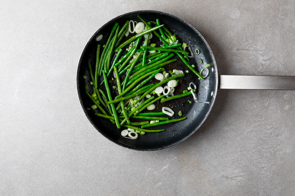 In einer großen, ofenfesten Pfanne die Bohnen und die Lauchzwiebeln mit 1-2EL Olivenöl auf hoher Hitze ca. 1-2Min. anbraten, dann den Thymian und Rosmarin untermischen.