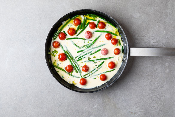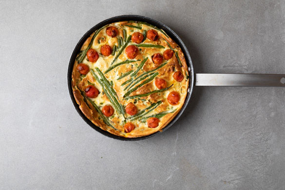 Unsere Köchin Hannah präsentiert dir hier ihre kreative herzhafte Version eines französischen Klassikers. Traditionell wird ein Clafoutis aus Kirschen oder anderem Obst und dem typischen, pfannkuchenartigen Teig zubereitet. Für dein heutiges Mahl übergießt du stattdessen einen Mix aus knackigen Sommerbohnen, saftigen Kirschtomaten und aromatischem Thymian mit dem schnell angerührten Teig. Als perfekte Ergänzung dazu gibt es