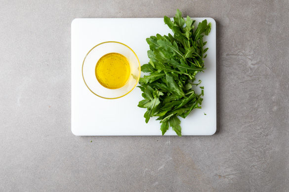 Währenddessen für den Salat 1-2EL Olivenöl, 1-2EL Essig, Salz, Pfeffer und 1 Prise Zucker zu einer Vinaigrette verrühren. Den Rucola kurz vor dem Servieren mit dem Dressing mischen und mit dem Gemüseclafoutis servieren.