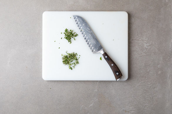 Die Thymianblätter und die Rosmarinblätter von den Stängeln streifen und fein hacken. Die Enden der Bohnen abschneiden. Die Lauchzwiebeln in dünne Ringe schneiden.