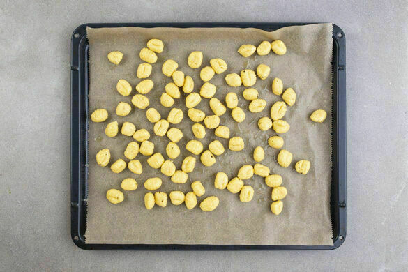 Die Gnocchi auf einem mit Backpapier ausgelegten Backblech verteilen und mit 2–3EL Olivenöl und 1/2TL Salz vermengen. 8–10Min. im Ofen backen, bis die Gnocchi goldbraun und knusprig sind.