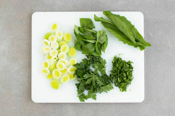 Den Backofen auf 240°C (220°C Umluft) vorheizen. Den Lauch in dünne Ringe schneiden. Die 1/2 des Sauerampfers sowie die Petersilie und das Basilikum samt Stängeln grob schneiden.
