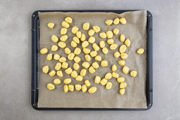 Die Gnocchi auf einem mit Backpapier ausgelegten Backblech verteilen und mit 2EL Olivenöl und 1 kräftigen Prise Salz vermengen. 8–10Min. im Ofen backen, bis die Gnocchi goldbraun und knusprig sind.