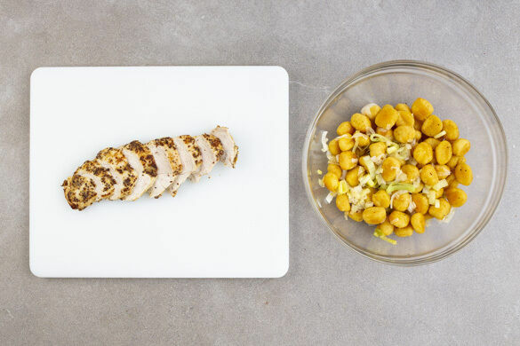 Das Fleisch schräg in Tranchen schneiden. Die Gnocchi in die Schüssel mit dem Lauch geben und alles gut vermengen. Die Sauce auf tiefe Teller verteilen, die Gnocchi und den Lauch darauf anrichten und das Fleisch darauf platzieren. Mit dem geschnittenen Sauerampfer garniert servieren.