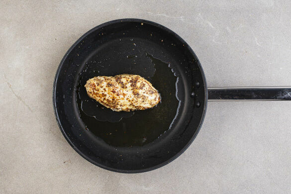 Das Fleisch trocken tupfen, mit dem Senf einreiben und mit 1 Prise Salz würzen. Das Fleisch in einer mittelgroßen Pfanne mit 1EL Olivenöl bei mittlerer Hitze auf jeder Seite 4–5Min. braten. Aus der Pfanne nehmen und warm halten.